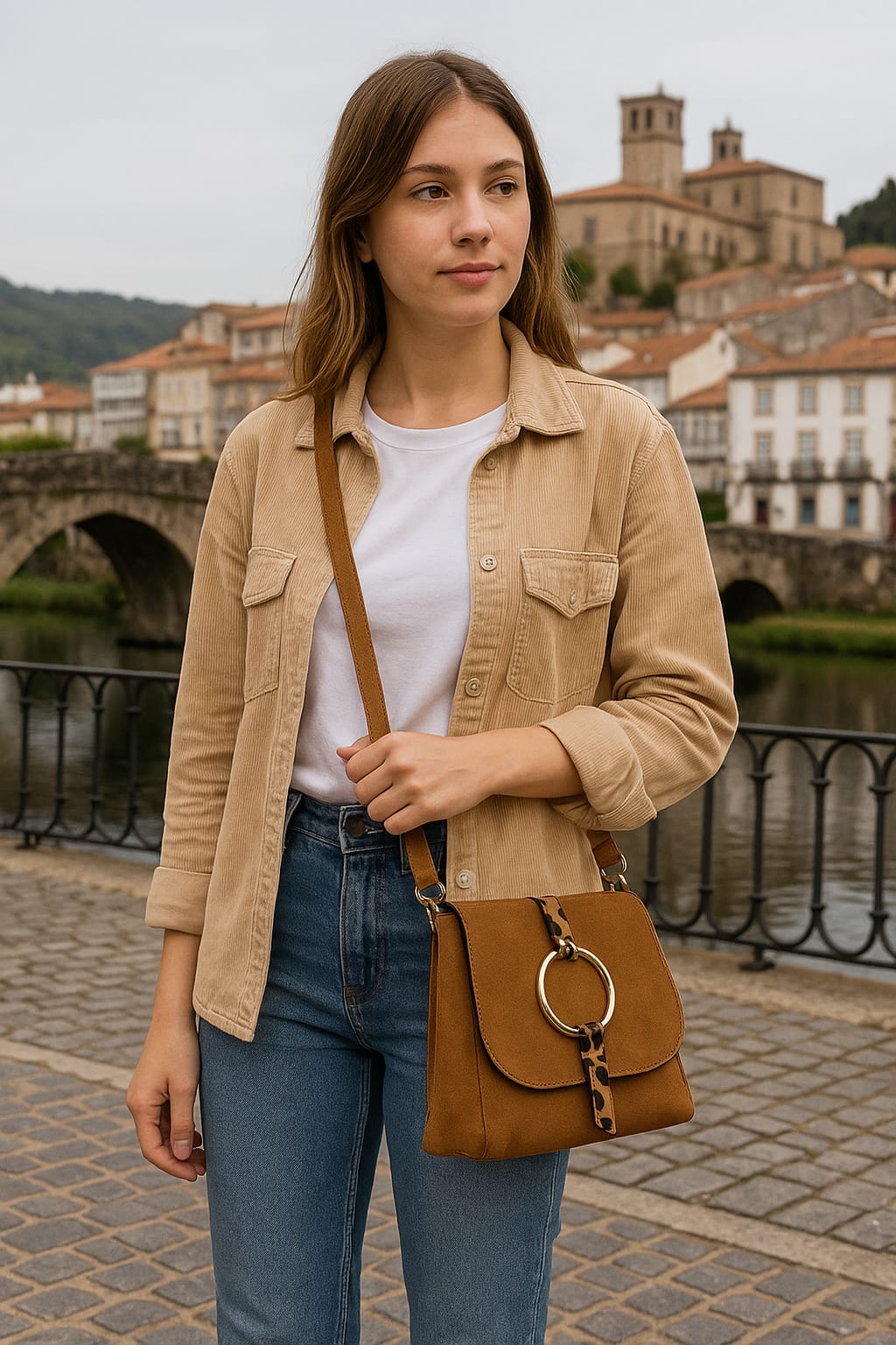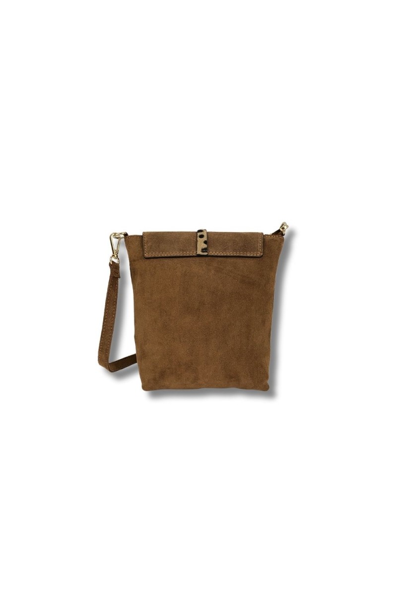 Bandolera serraje con solapa, detalle arandela rematada en leopardo. Asa bandolera opcional ajustable. Forro interior con bolsillo cerrado cremallera.