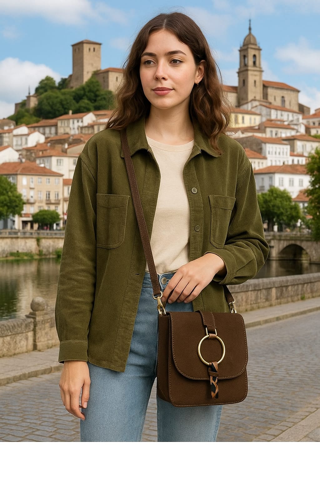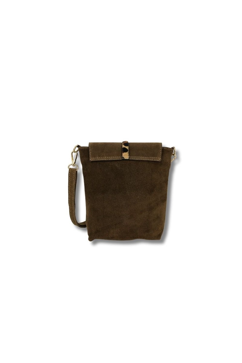 Bandolera serraje con solapa, detalle arandela rematada en leopardo. Asa bandolera opcional ajustable. Forro interior con bolsillo cerrado cremallera.