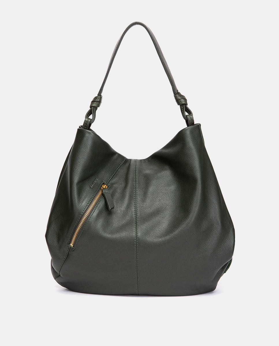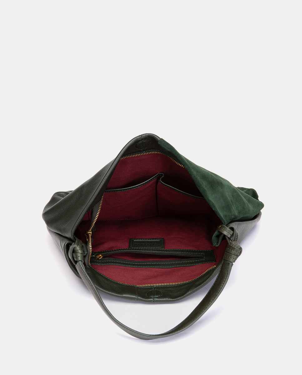 Bolso de hombro estilo hobo que combina piel y ante, creando un elegante contraste de texturas, perfecto para el uso diario. Sus principales características son:
