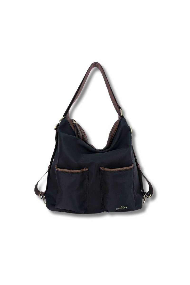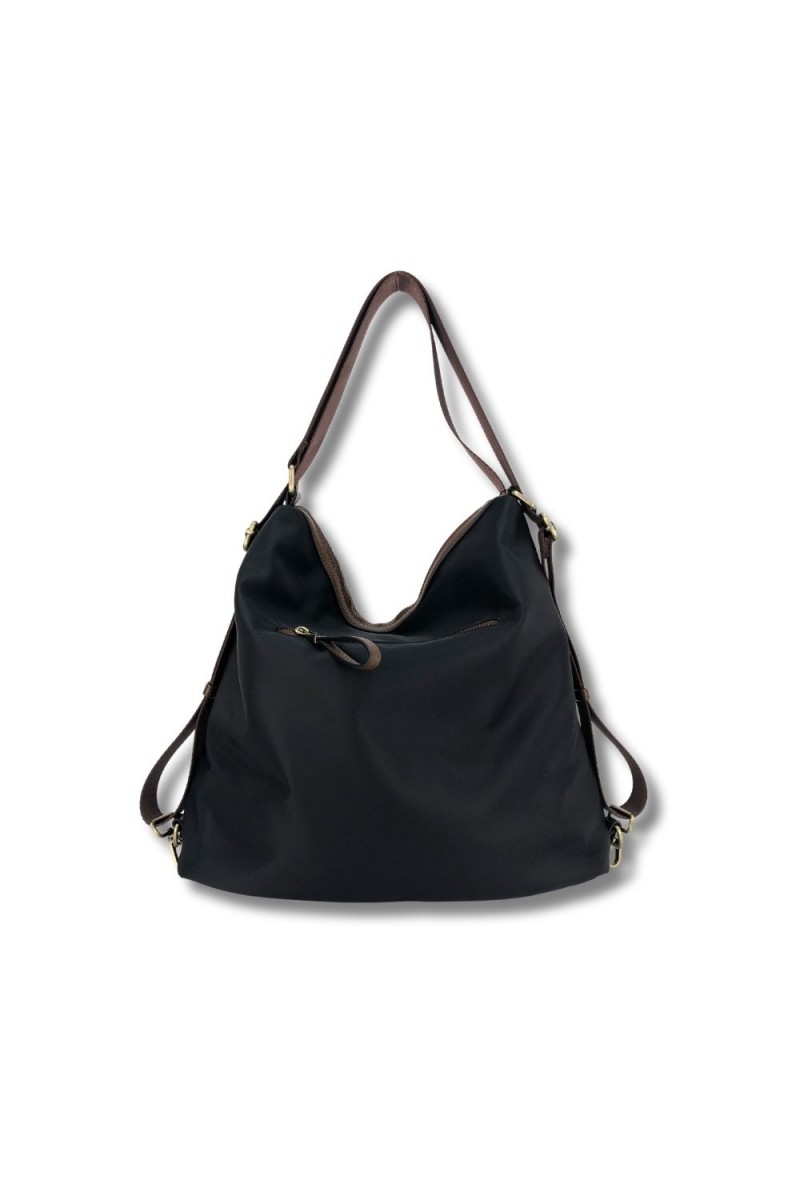 Bolso/mochila nylon cerrado con cremallera. Asas regulables. Bolsillos exteriores delanteros con imán y bolsillo trasero con cremallera. Interior forro rayado. Dos bolsillos internos: uno con cremallera y otro organizador. Tiradores cremallera personalizados.