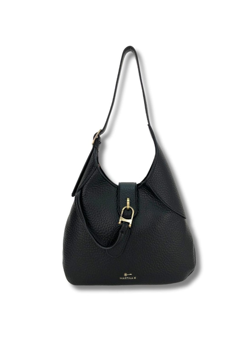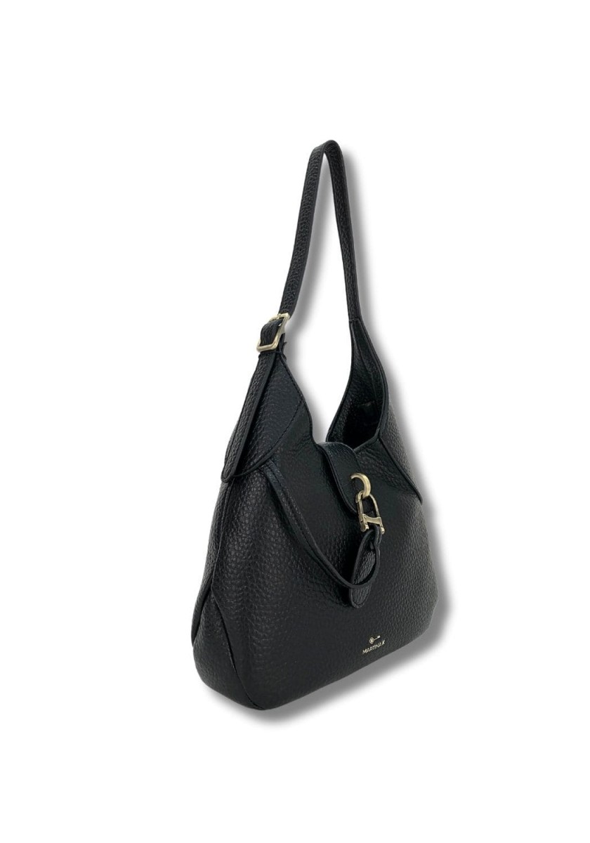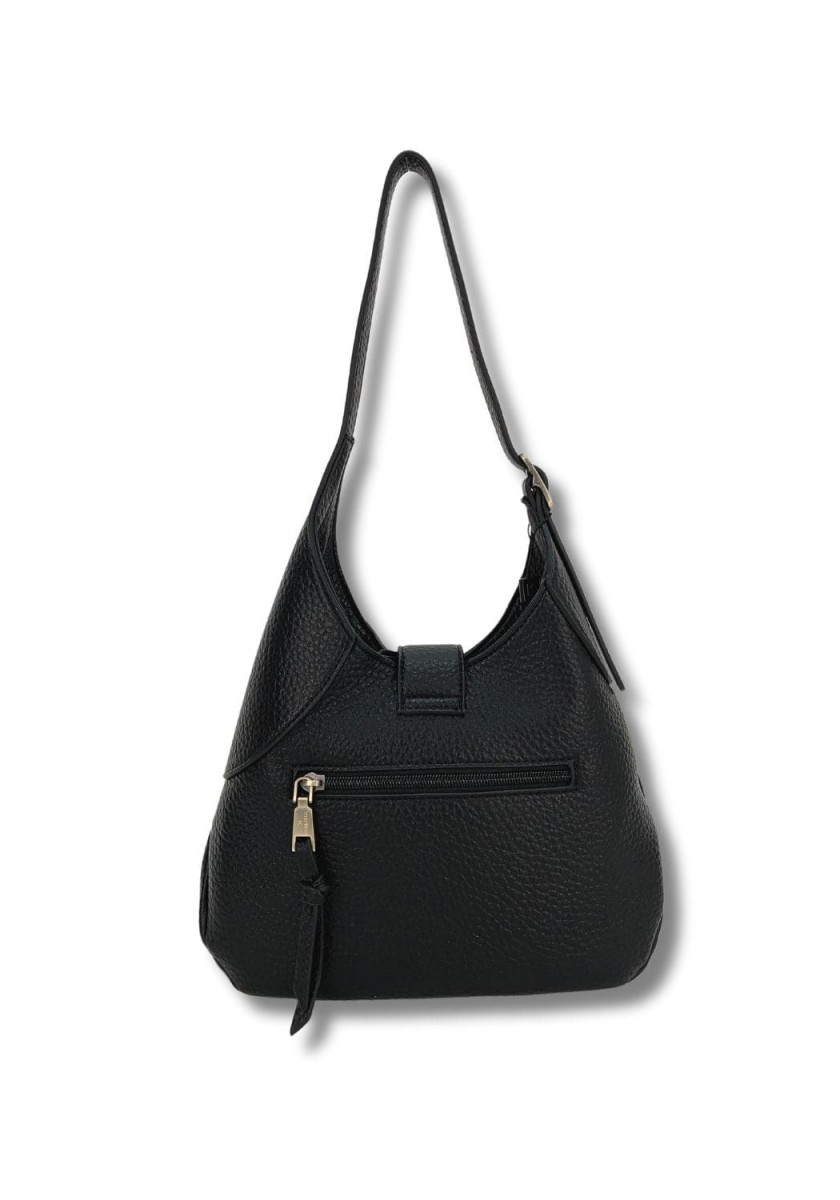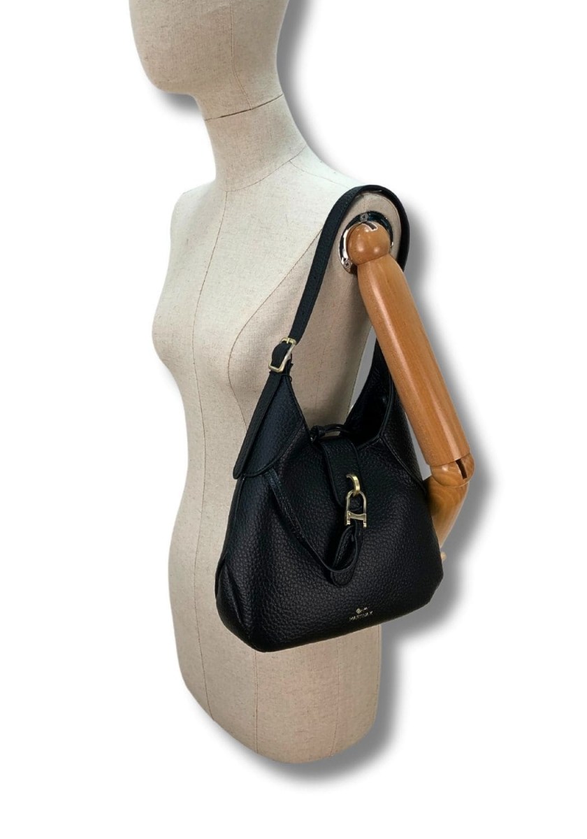 Hobo pequeño grabado, cerrado con cremallera y lengüeta con mosquetón. Asa regulable. Bolsillo exterior trasero cerrado. Forro interior con dos bolsillos uno cerrado con cremallera y otro organizador.