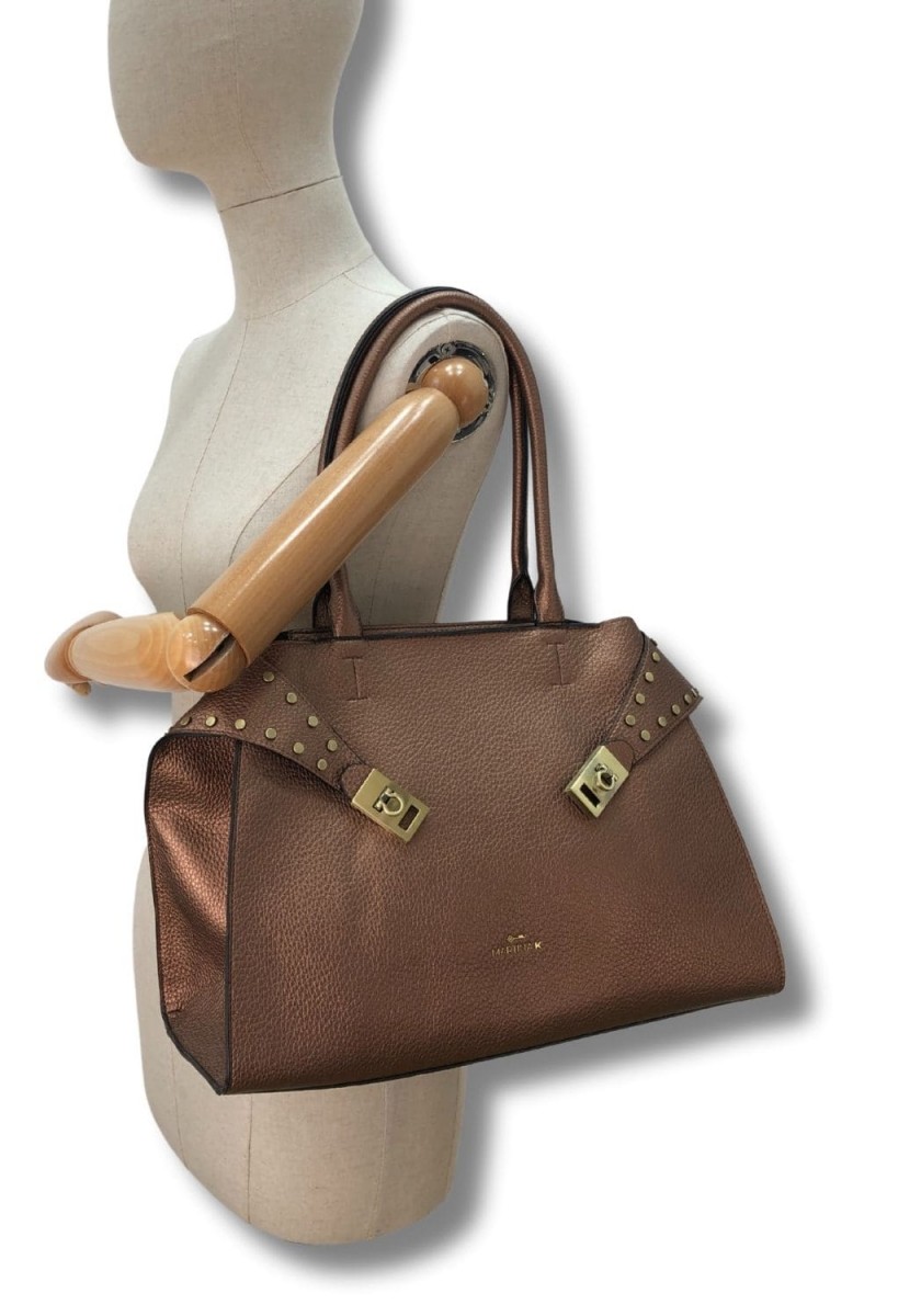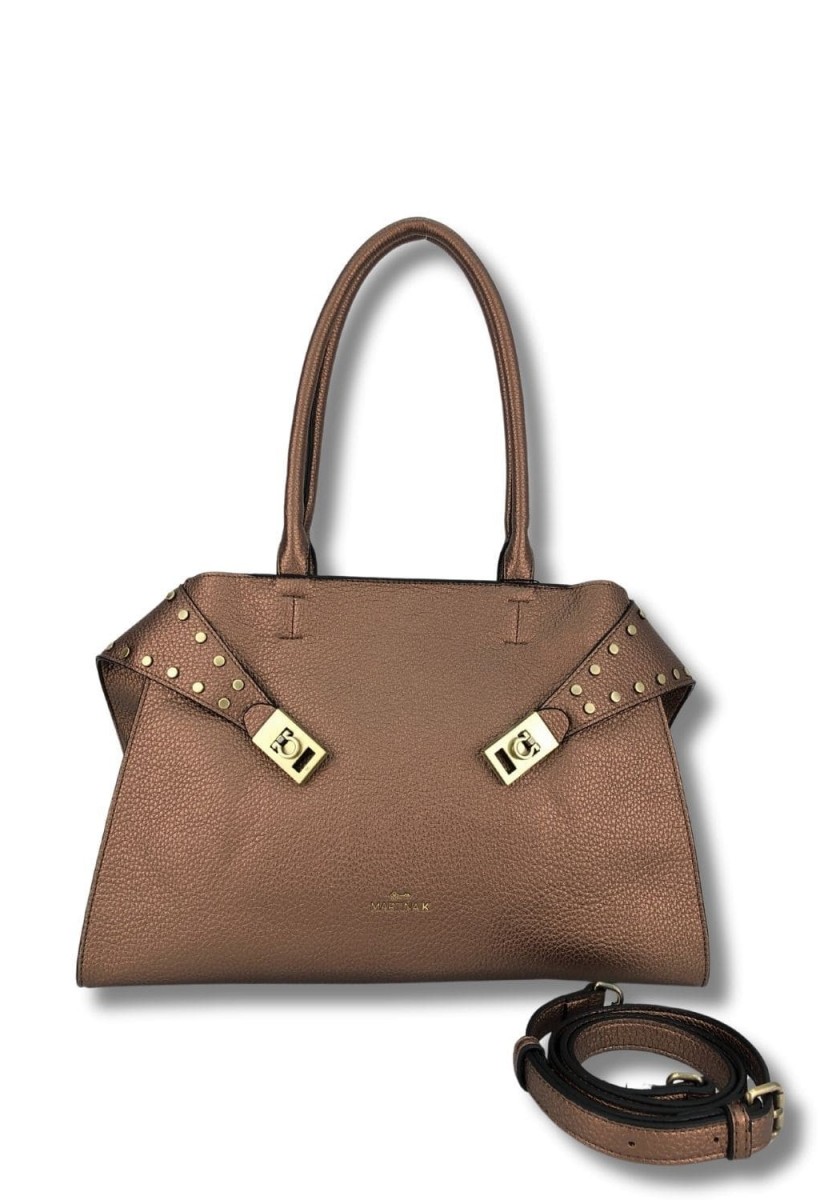 Bolso shopping con doble hebilla frontal y detalle tachuelas. Doble asa de hombro y asa bandolera ajustable opcional. Cerrado con cremallera. Acabado en antelina y con bolsillo organizador interior.